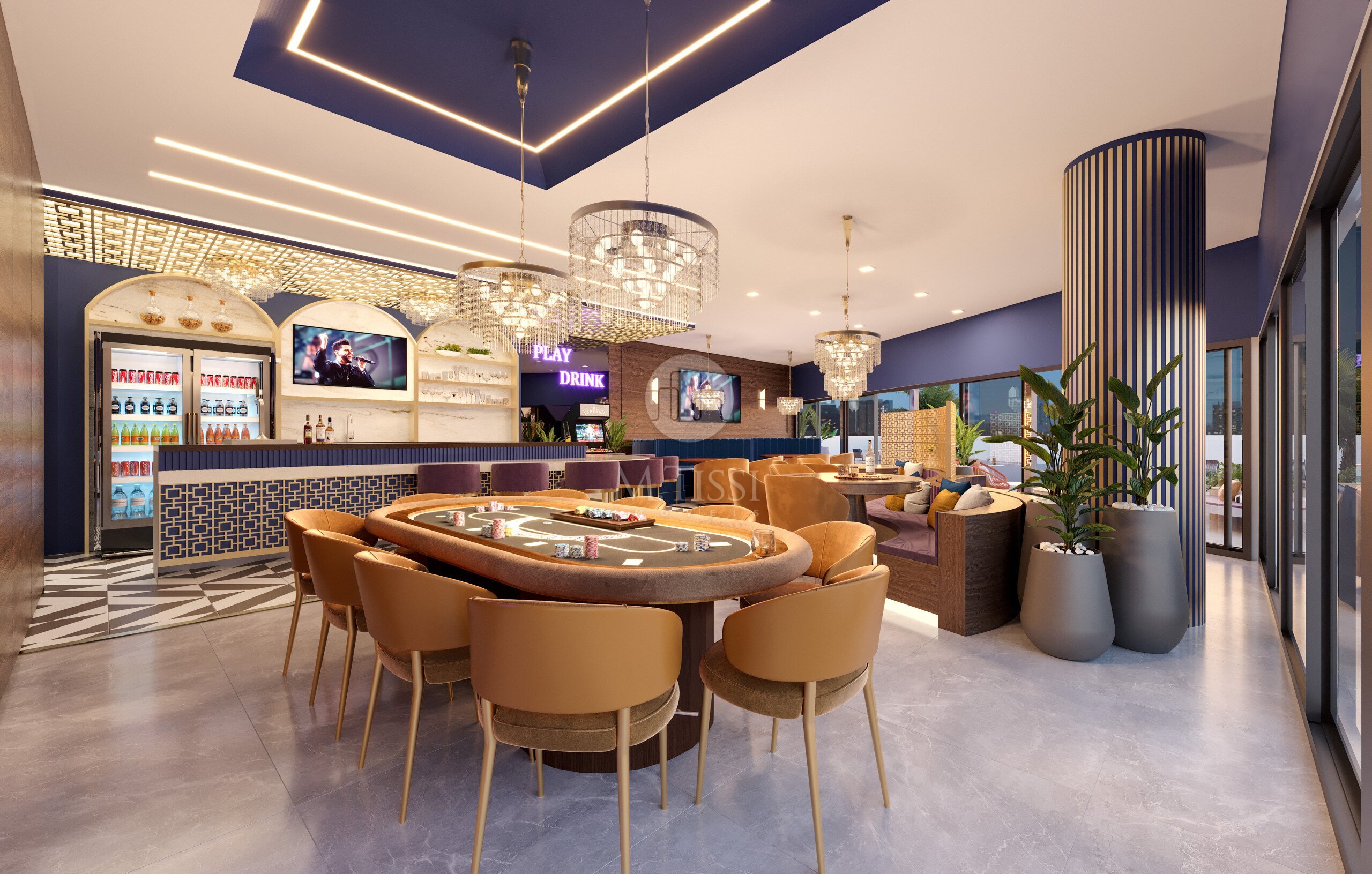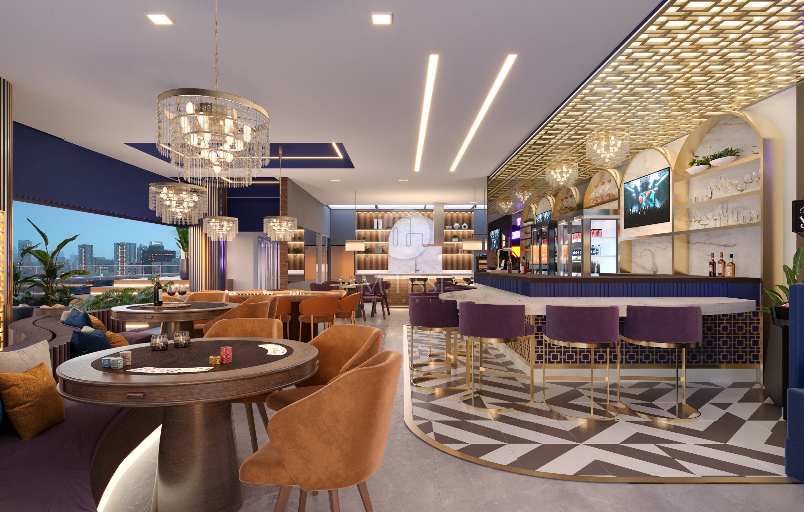 - Hub Bar 24 horas: Equipado com 3 televisores de 75 polegadas, cozinha industrial, cervejeira profissional, vending machines e mesas de poker;