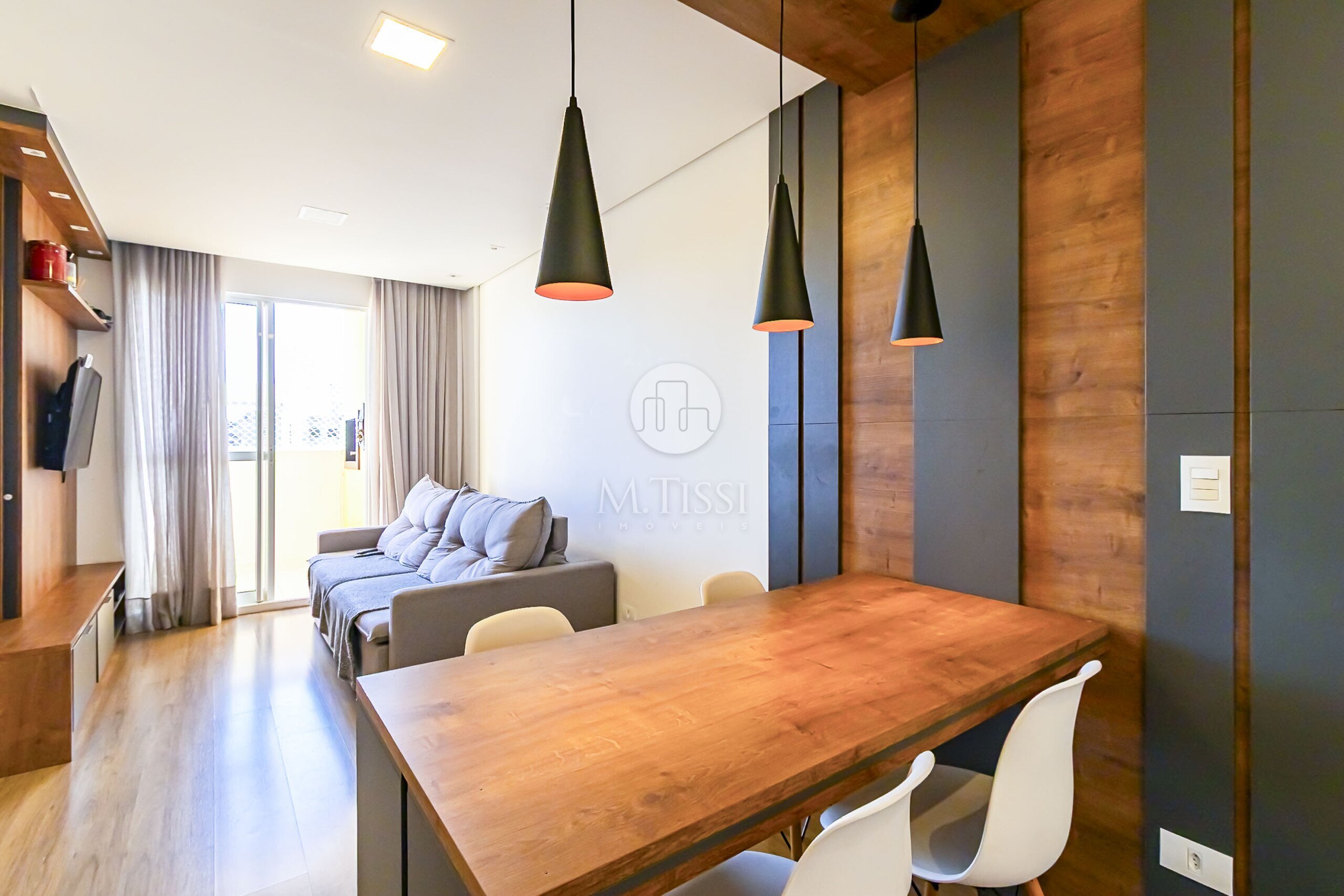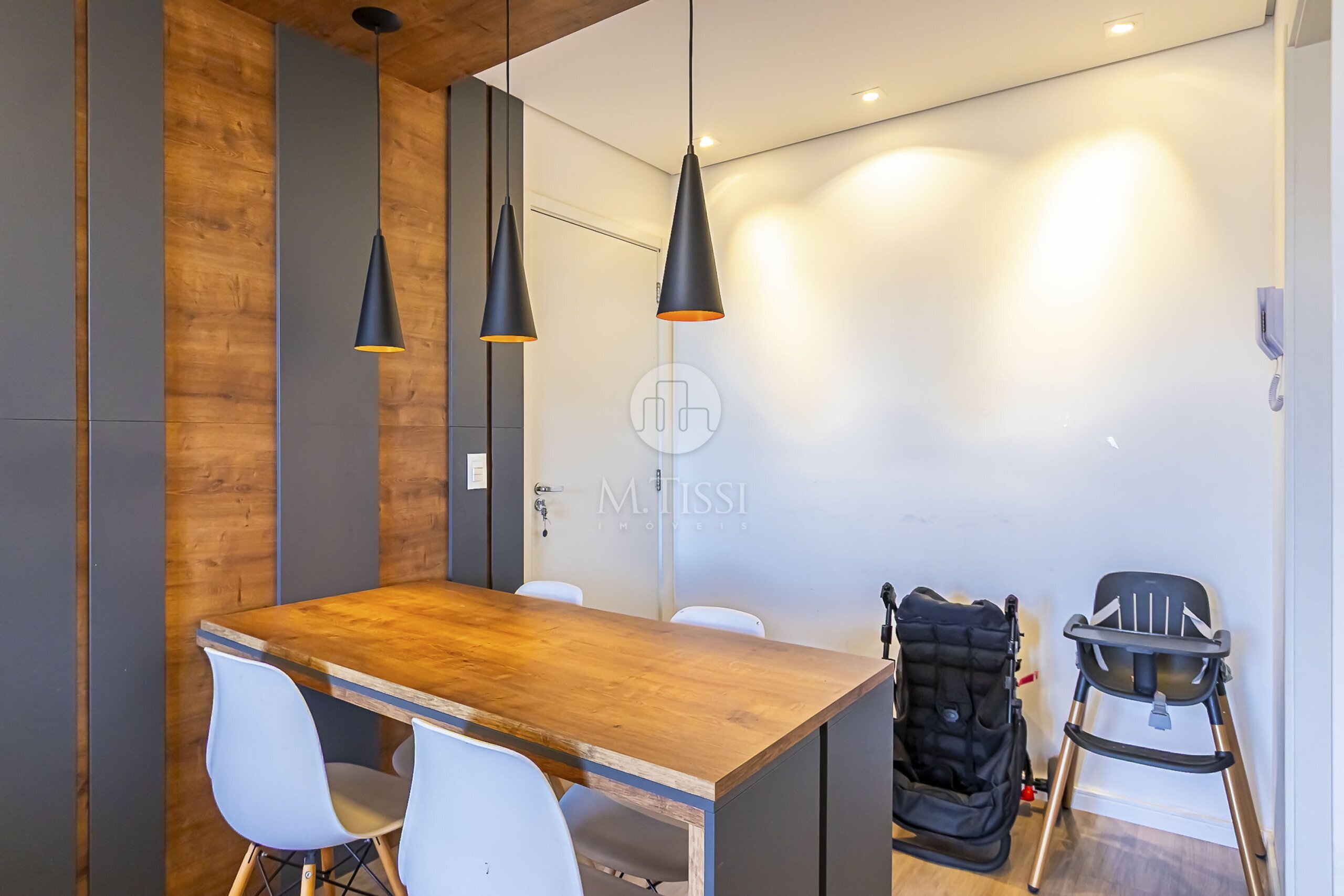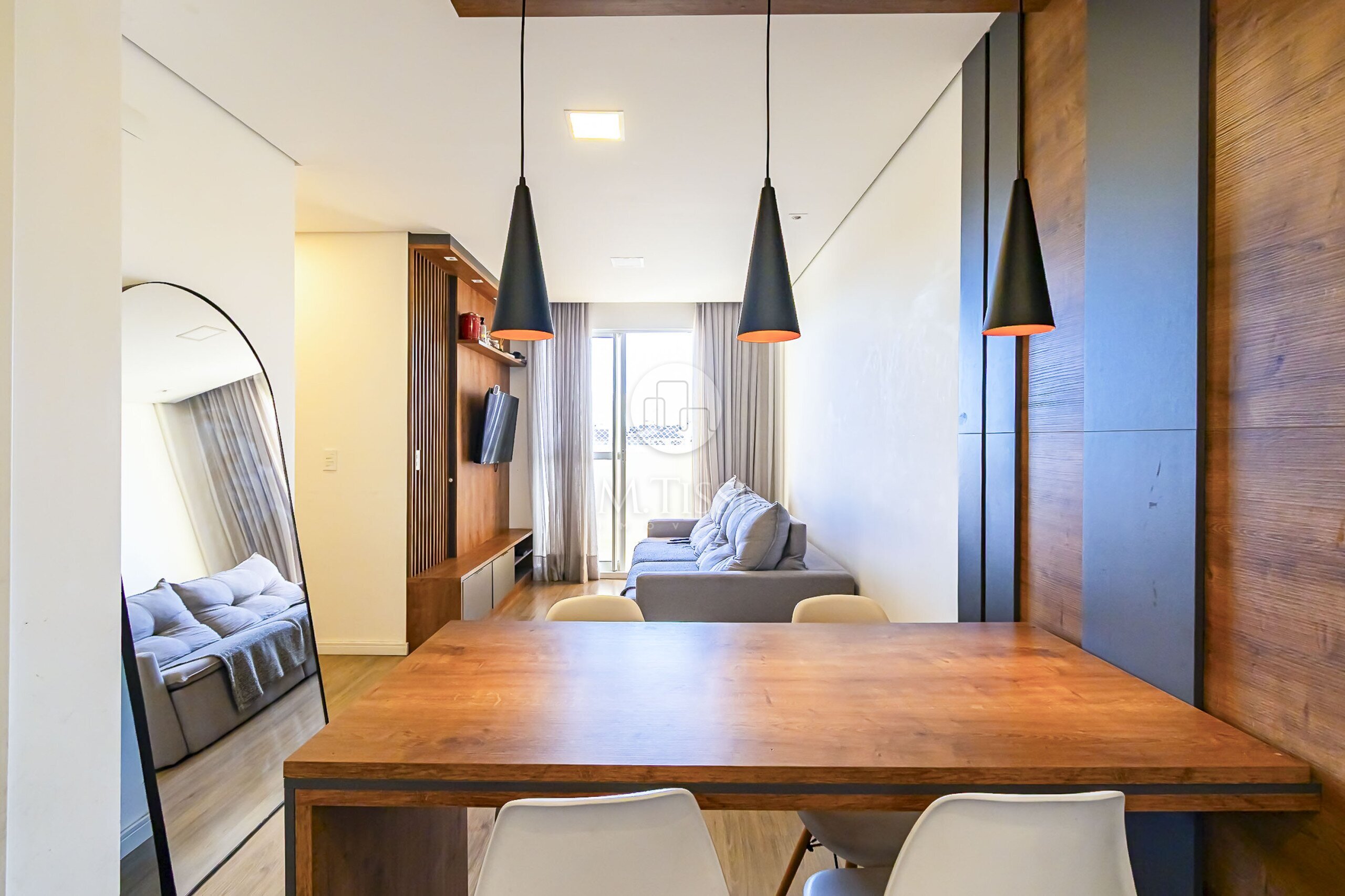 - Mesa e painel em madeira decorativo na sala de jantar;