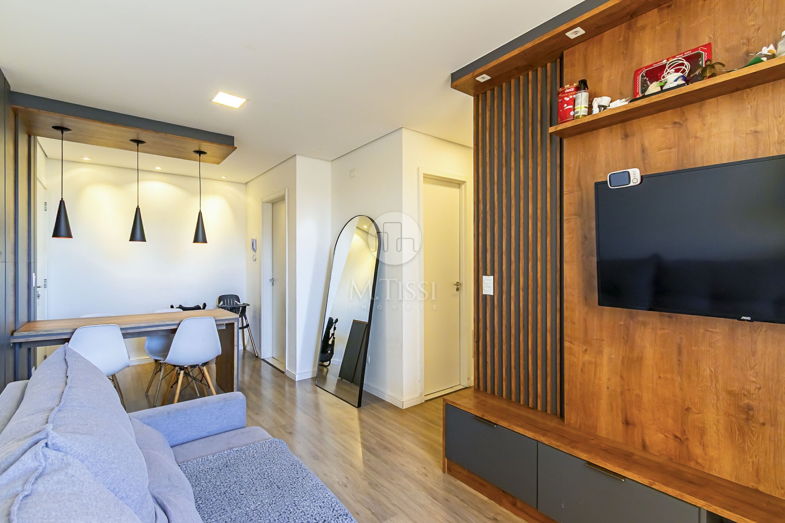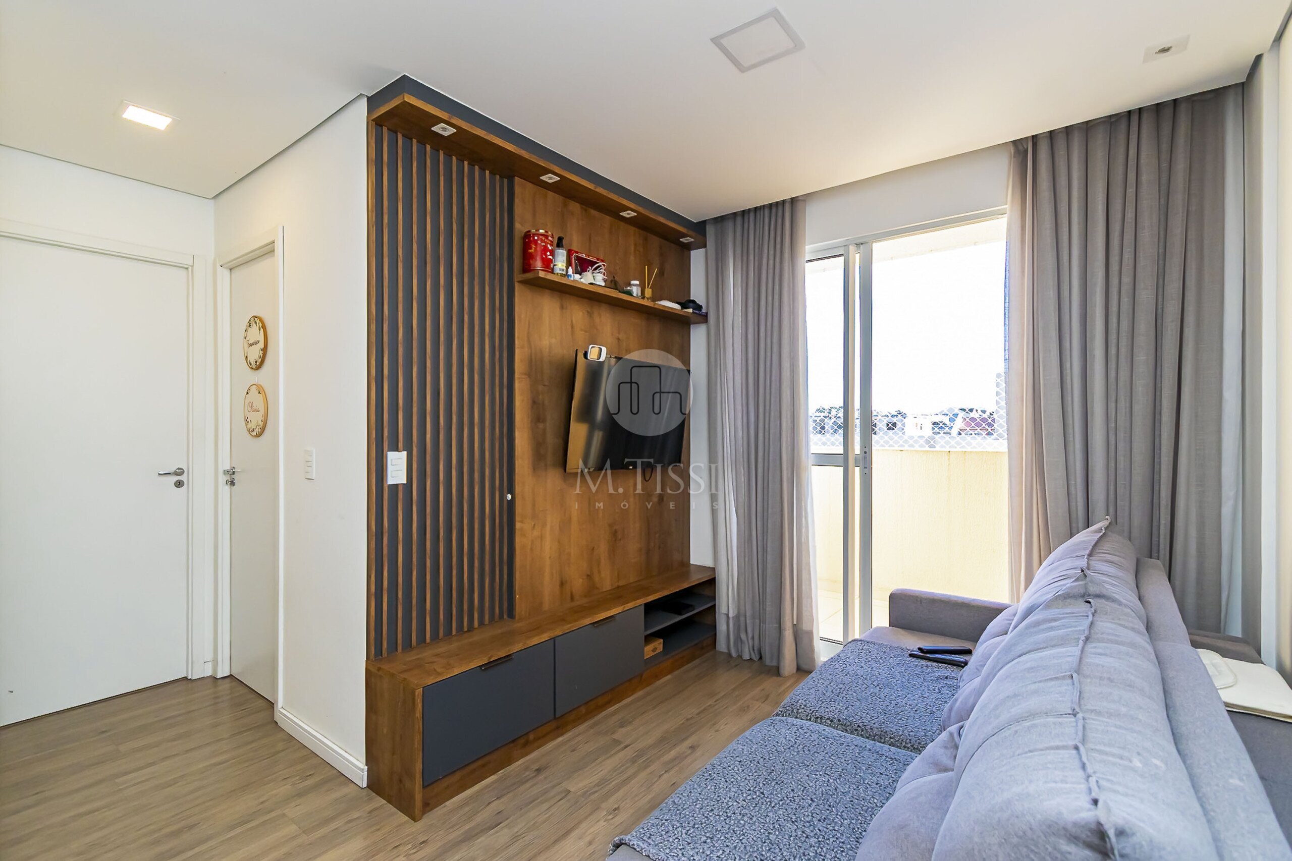 - Painel ripado e rack em madeira na sala de TV;